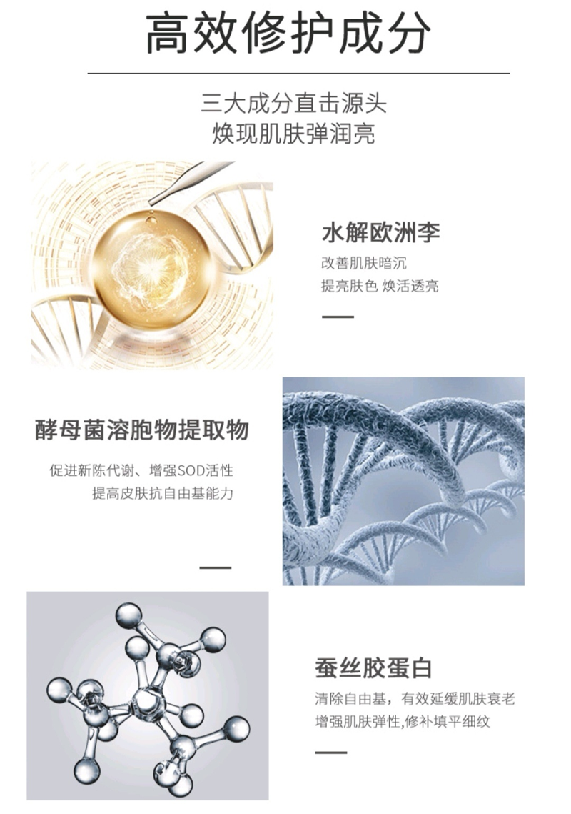 甄选:酵母菌发酵产物滤液,水解透明质酸钠,胶原、银耳多糖等精粹成分;复合:积雪草,光果甘草根,杂交玫瑰花,迷迭香叶等多种提取物,补水保湿,改善肌肤粗糙干燥,舒缓肌肤不适,保湿润颜,柔润嫩滑,令肌肤细腻光滑,水嫩弹润,水光靓丽