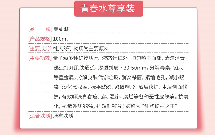 蕴含多种天然矿物质精华,易吸收、帮助吸收,舒缓修护,舒纹紧致,细致毛孔,肌肤光滑细腻