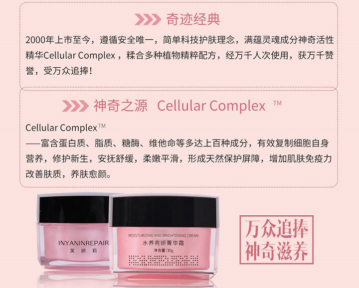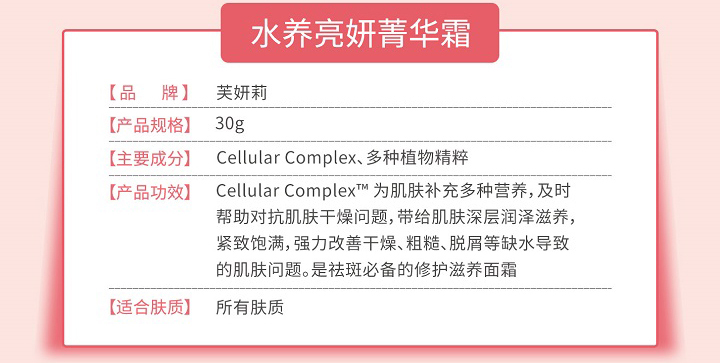 为肌肤补充多种营养,及时帮助对抗肌肤干燥问题,带给肌肤深层润泽滋养,紧致饱满,强力改善干燥,粗糙、脱屑等缺水导致的肌肤问题。是减斑的修护滋养面霜。