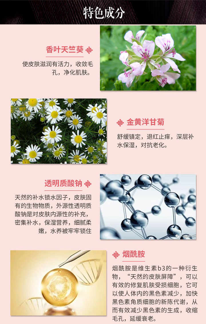 滋润缺水皮肤,锁紧皮肤水分。莹润,匀亮肌肤,弹嫩,使肌肤绽现柔润光泽