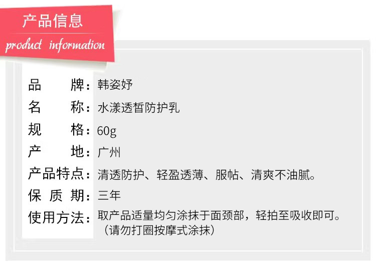 韩姿妤 水漾透皙防护乳60g 清爽防晒不油腻、轻盈透薄/服贴、全身皮肤均可用