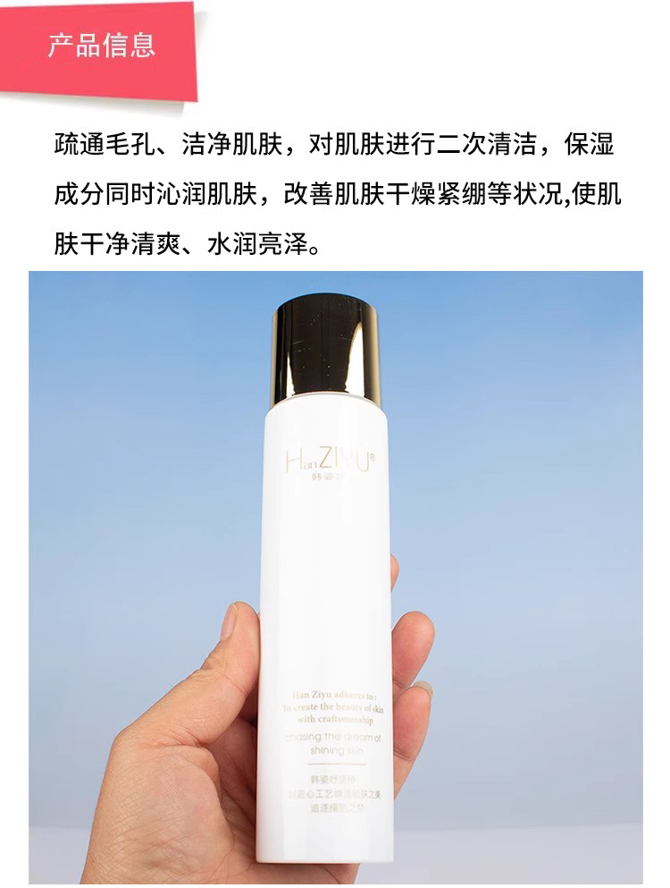 疏通毛孔、洁净肌肤,对肌肤进行二次清洁,保湿成分同时沁润肌肤,改善肌肤干燥紧绷等状况,使肌肤干净清爽、水润亮泽