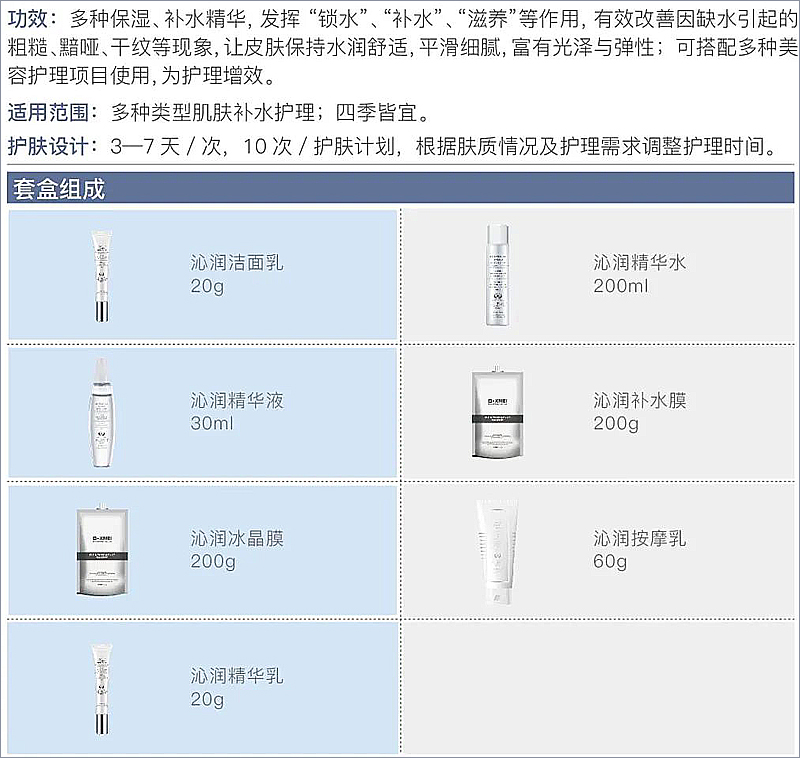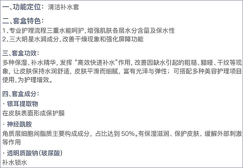 多种保湿、补水精华,发挥“锁水”、“补水”、‘滋养”等作用,有效改善因缺水弓|起的粗糙、黯哑、干纹等现象,让皮肤保持水润舒适,平滑细腻,富有光泽与弹性;可搭配多种美容护理项目使用,为护理增效
