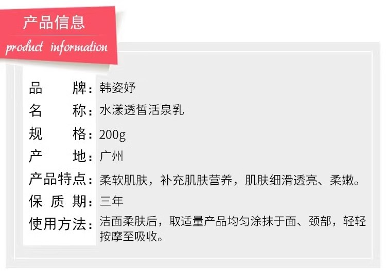 韩姿妤 水漾透皙活泉乳200g 柔软肌肤、补充营养、细滑透亮、柔嫩饱满