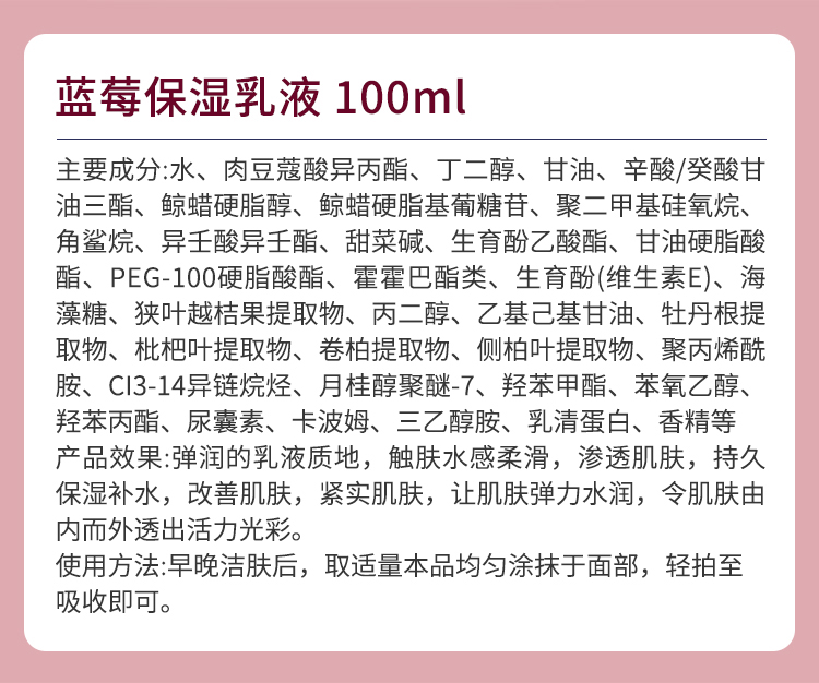 弹润的乳液质地,触肤水感柔滑,渗透肌肤,持久保湿补水,改善肌肤,紧实肌肤,让肌肤弹力水润,令肌肤由内而外透出活力光彩