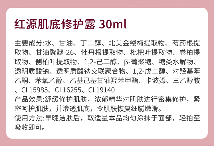 舒缓修护肌肤,浓郁精华对肌肤进行密集修护,紧密呵护肌肤,并渗透肌底,令肌肤恢复细腻嫩滑