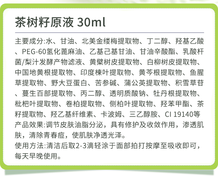 蒂曼莱儿 茶树籽原生液30ml 调节皮肤油脂分泌,修护及收敛,改善青春痘、粉刺,净透光泽