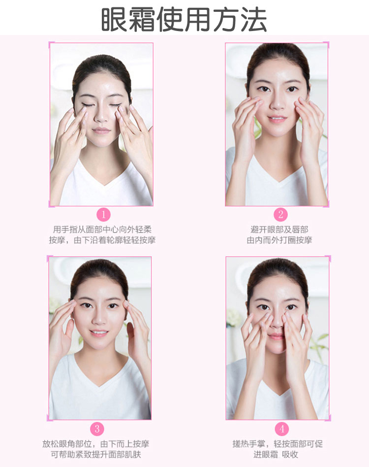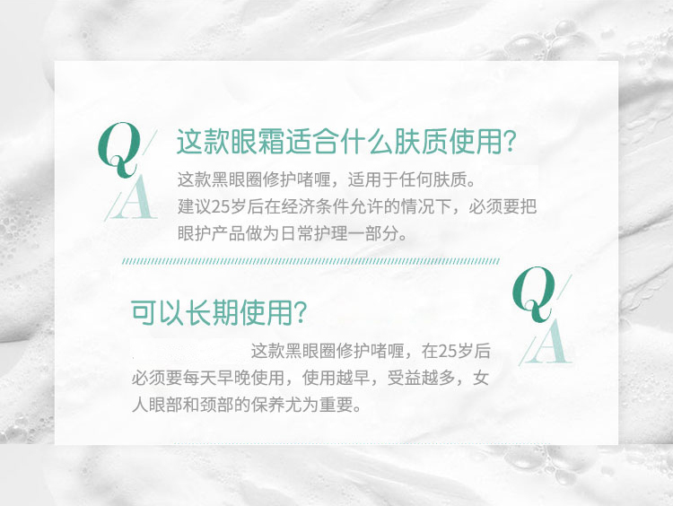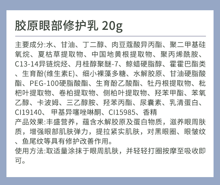 丰盛营养,蕴含水解胶原及蛋白物质,滋养眼周肤质,增强眼部肌肤弹力,提拉紧实肌肤,对黑眼圈、眼皱纹、鱼尾纹等具有修护改善作用