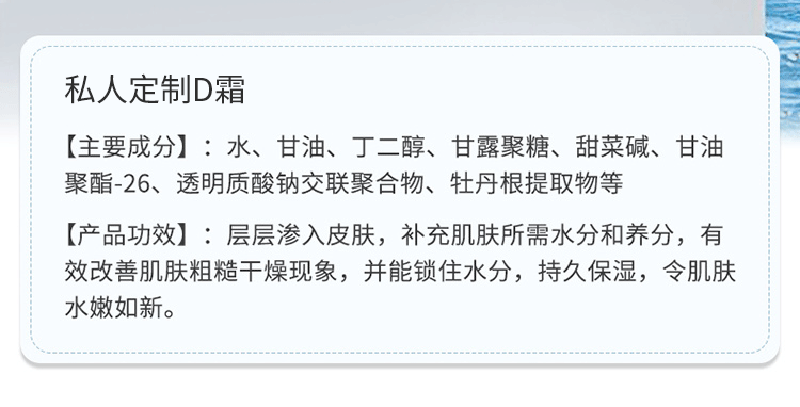 层层渗入皮肤,补充肌肤所需水分和养分,有效改善肌肤粗糙干燥现象,并能锁住水分,持久保湿,令肌肤水嫩如新