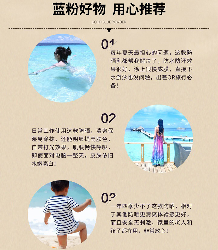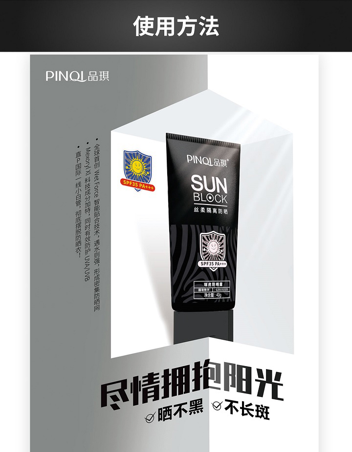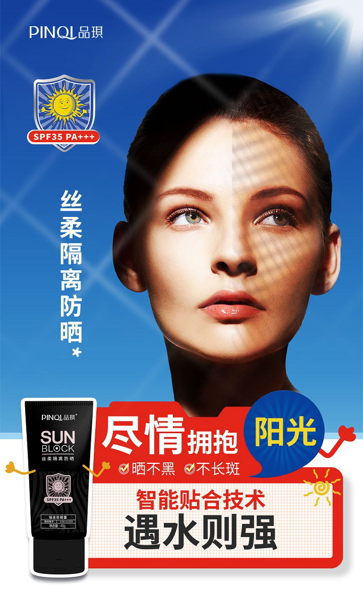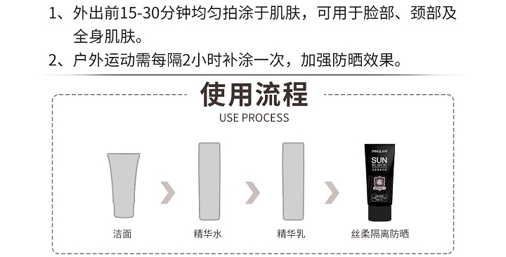 质地清爽、易推开、无黏腻感、不影响后续上妆。含UVA、UVB吸收隔离成分,有效阻挡阳光和紫外线的伤害