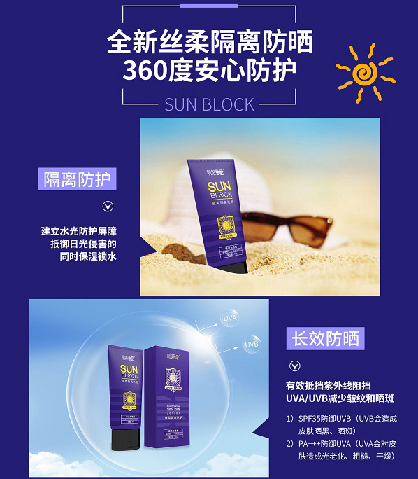 质地清爽、易推开、无黏腻感、不影响后续上妆。含UVA、UVB吸收隔离成分,有效阻挡阳光和紫外线的伤害