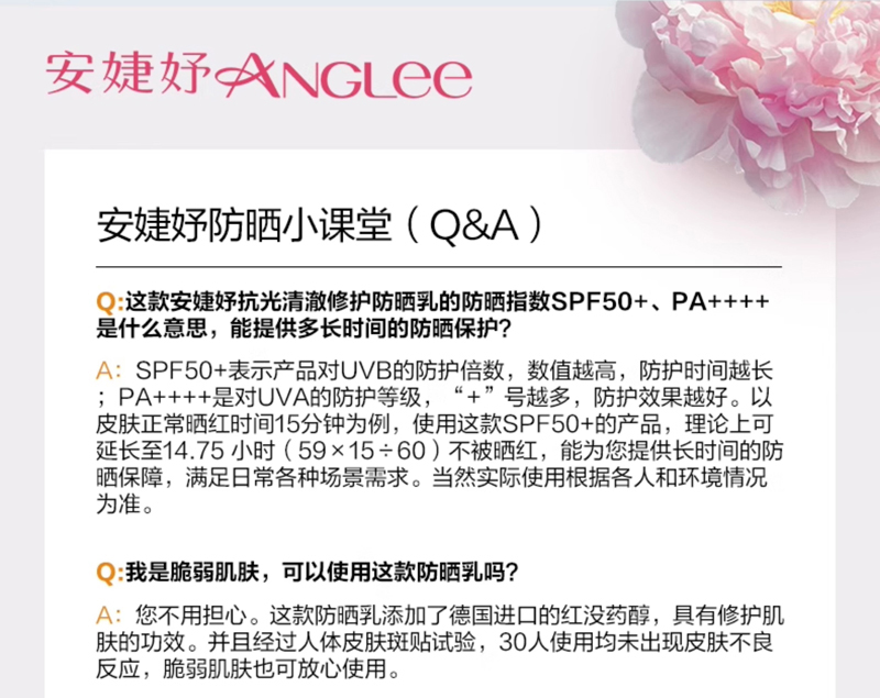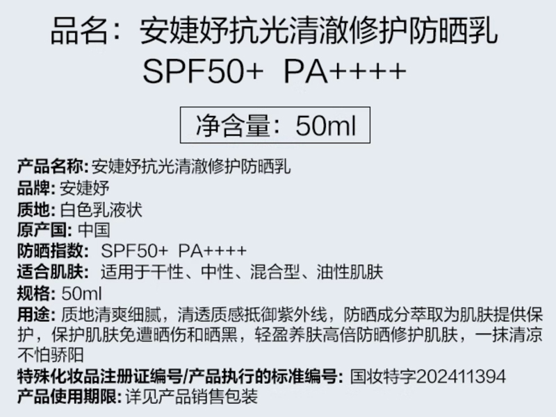 安婕妤 抗光清澈修护防晒乳50gSPF50+ 质地清爽细腻、抵御紫外线、避免肌肤晒伤和晒黑