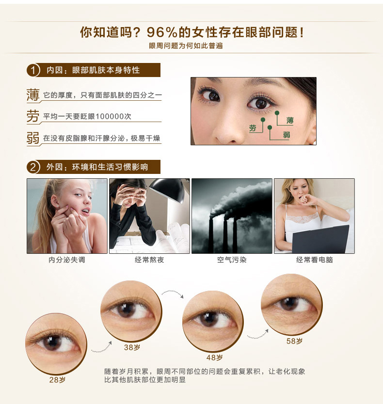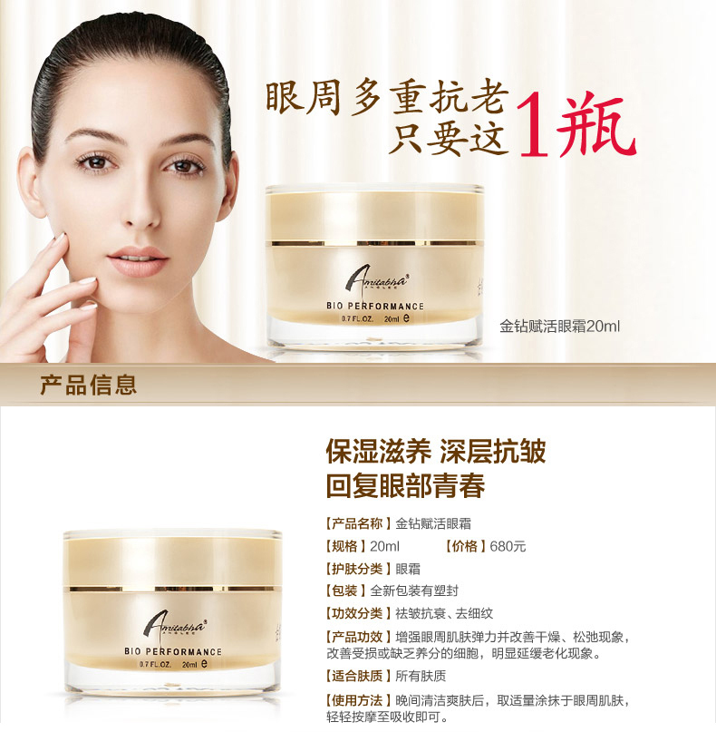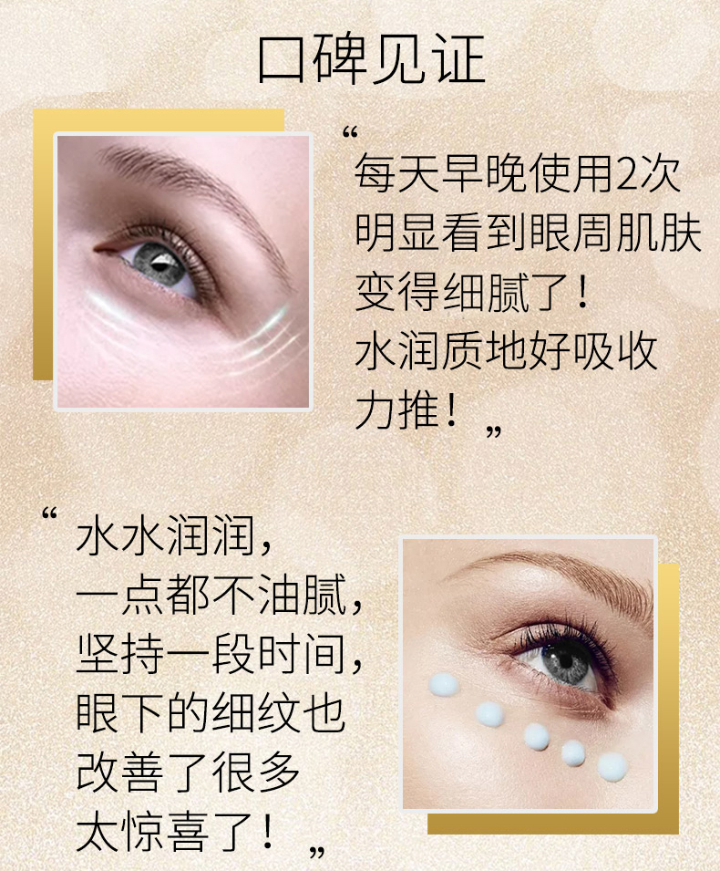 1.多效抗衰眼霜产品,触感柔细润泽不腻,眼部肌肤吸收后无任何负担。