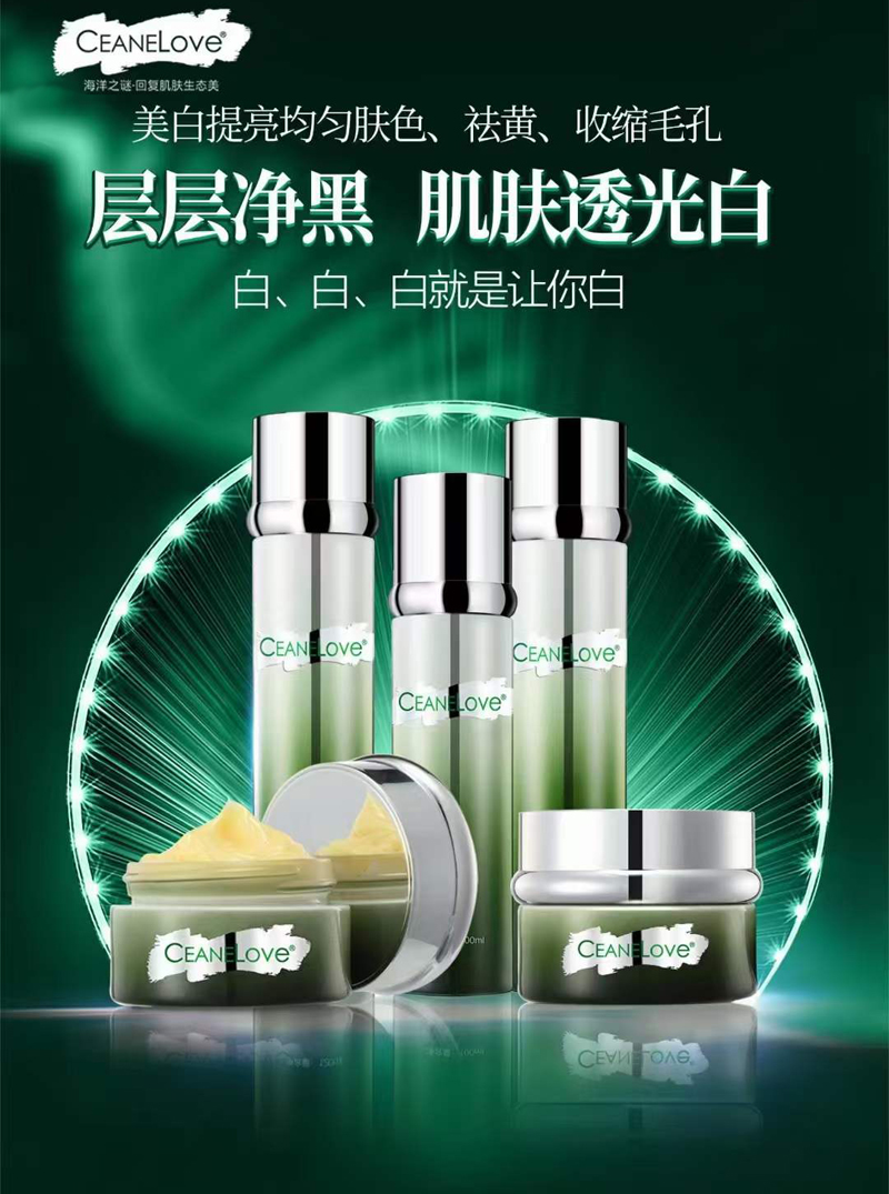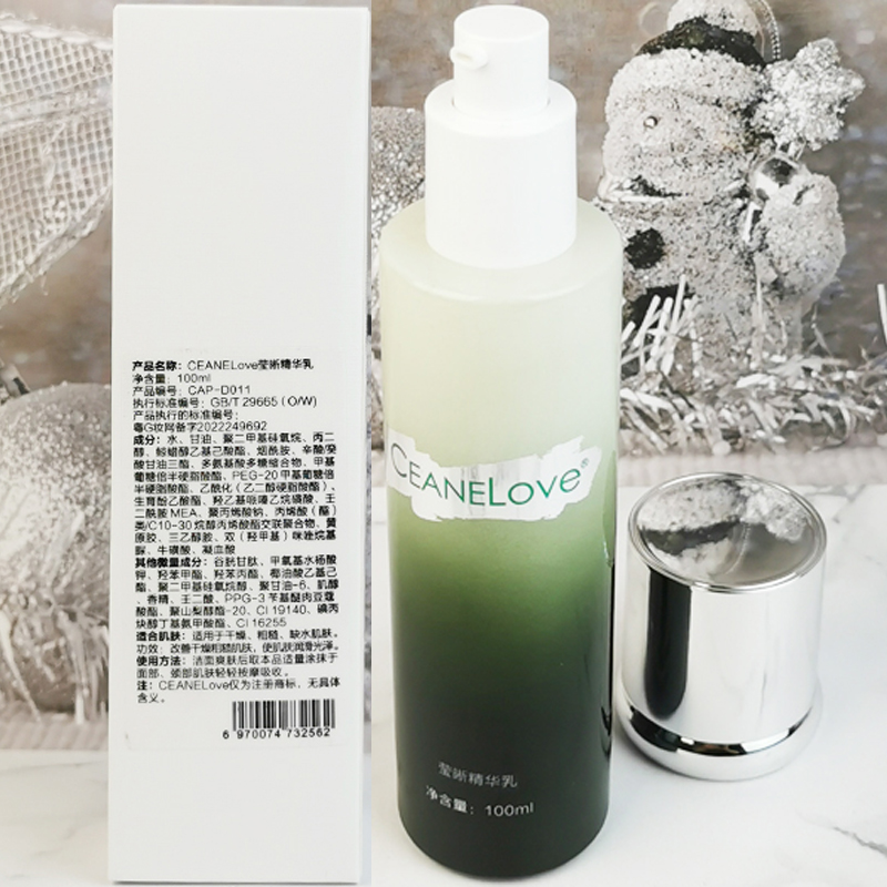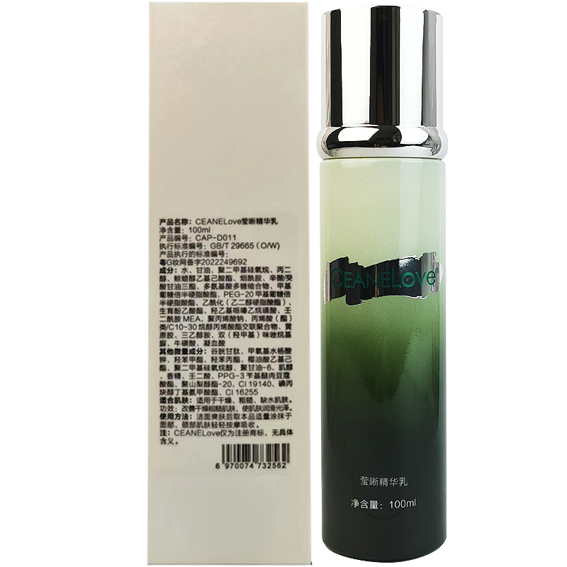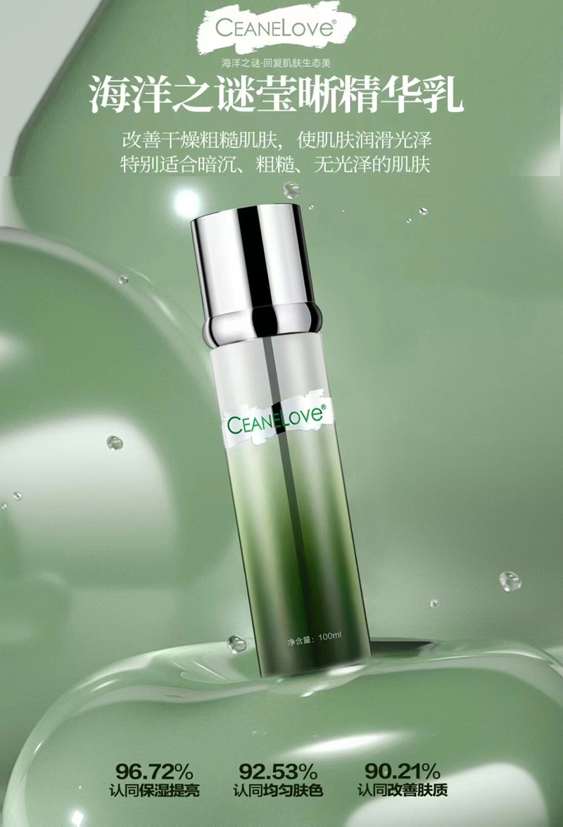 CEANELOVE海洋之谜 海藻莹白精华乳100ml 适宜类型:中干性、混合性、肤色晦暗或不均、色素性的肌肤类型 主要成分:天然米糠萃取物、神经酰胺、左旋VC、SPD、松藻精华 产品功效:细腻柔润的乳液质地,瞬间渗入肌肤,积极修护、补水、滋养,及时改善肤色,增强弹性,恢复光滑细致,令肌肤焕然一新,嫩白无暇。 产品用量:1ml/次 使用方法:早晚洁肤、爽肤、精华后,取适量本品均匀涂抹于面部肌肤轻揉吸收即可。