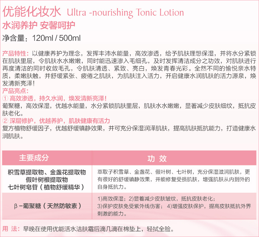 产品用途:以健康养护为理念,发挥丰沛水能量,给与肌肤理想保湿,并将水分紧锁在肌肤里层,令肌肤水水嫩嫩,同事能迅速渗入细毛孔,及时发挥清洁成分之功效,对肌肤进行再度清洁的同时收敛毛孔,令肌肤清透、紧致、焕发青春光彩。全然不同的愉悦亲水特质,柔嫩肤触,并舒缓紧张、疲倦之肌肤,为肌肤注入活力从而给予肌肤全新的感受