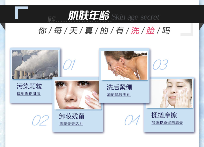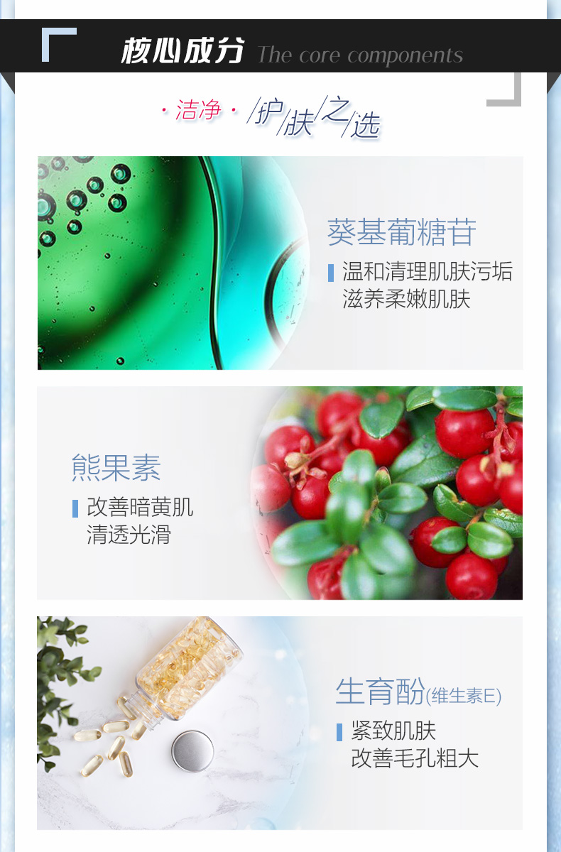 它完全 不含皂,性情温和,PH值为5.5弱酸性的配方,而且洗后肤质柔嫩光滑不紧绷,并且内含抗老化成份维他命E.以及黑色素分解酵素成份,能使黑色素分解,洗脸,亮白一次完成。