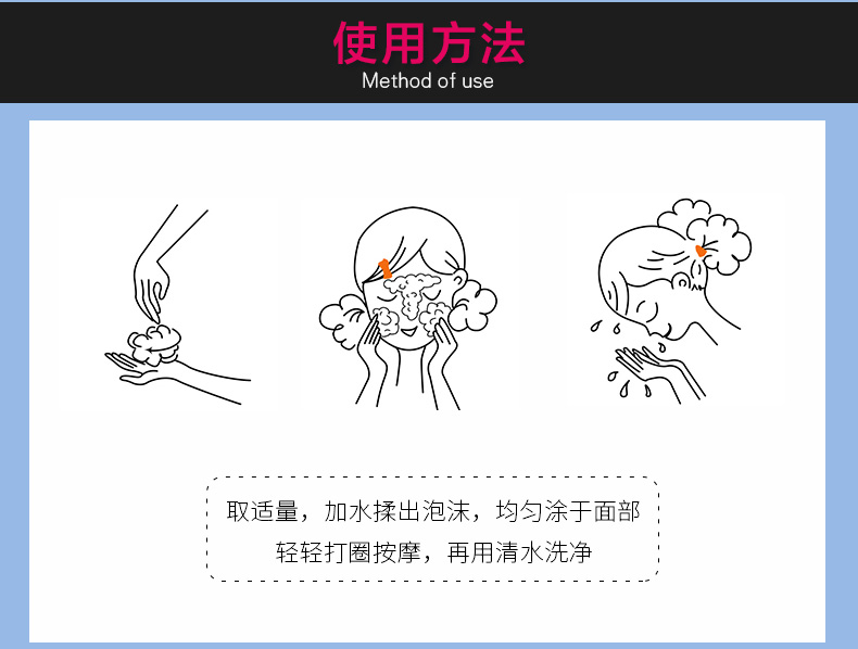 使用方法:取适量充分起泡后,以按摩方式洗脸,再以温水彻底洗净即可.