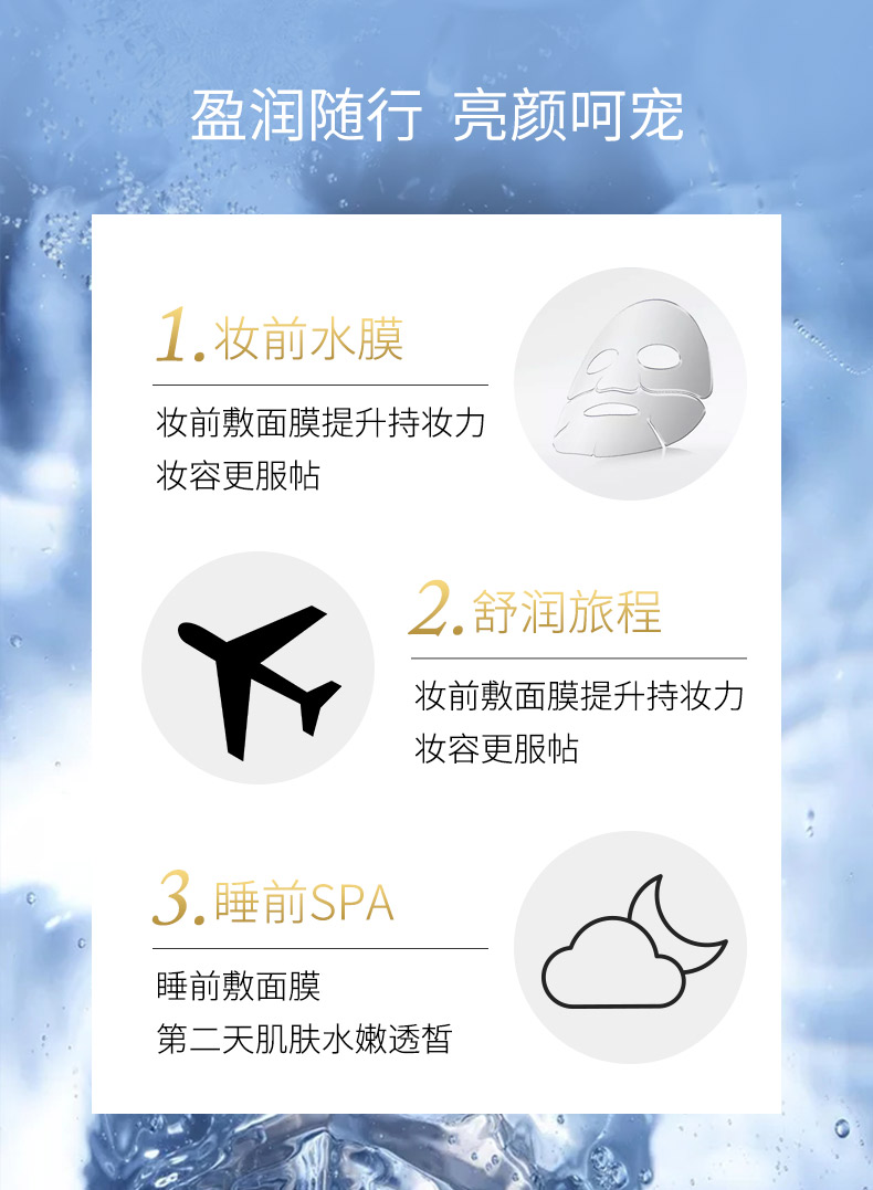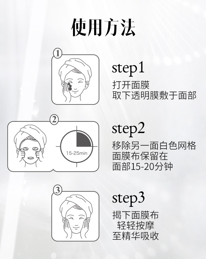 使用方法:清洁面部洁肤,打开包装取出面膜展开,面膜敷于面部,并贴紧肌肤,放松享受15-20分钟,揭下面膜将多余液体轻拍吸收(每周1-2次)。