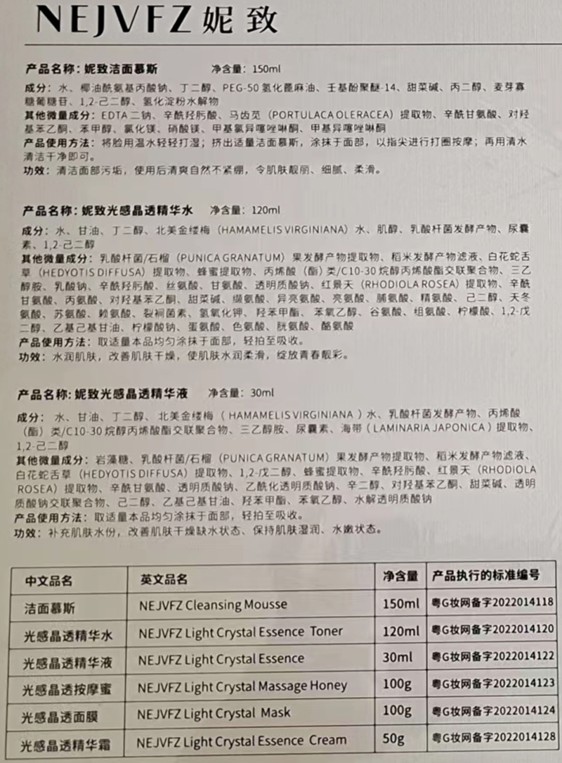 1.洁面150ml 2.光感晶透精华水120ml 3.光感晶透精华液30ml 4.光感晶透按摩蜜100g 5.光感晶透面膜100g 6.光感晶透精华霜50g