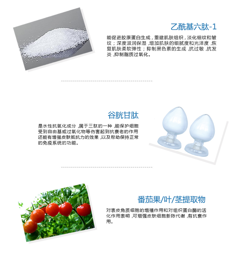 主要成分:奥氏海藻提取物、透明质酸、生物多肽、营养因子复合物(红景天提取物、缬氨酸、亮氨酸、异亮氨酸)。