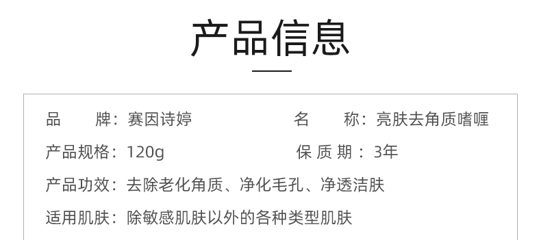 • 商品名称:赛因诗婷 亮肤去角质啫喱120g 去除老化角质、净化毛孔/黑头、净透洁肤