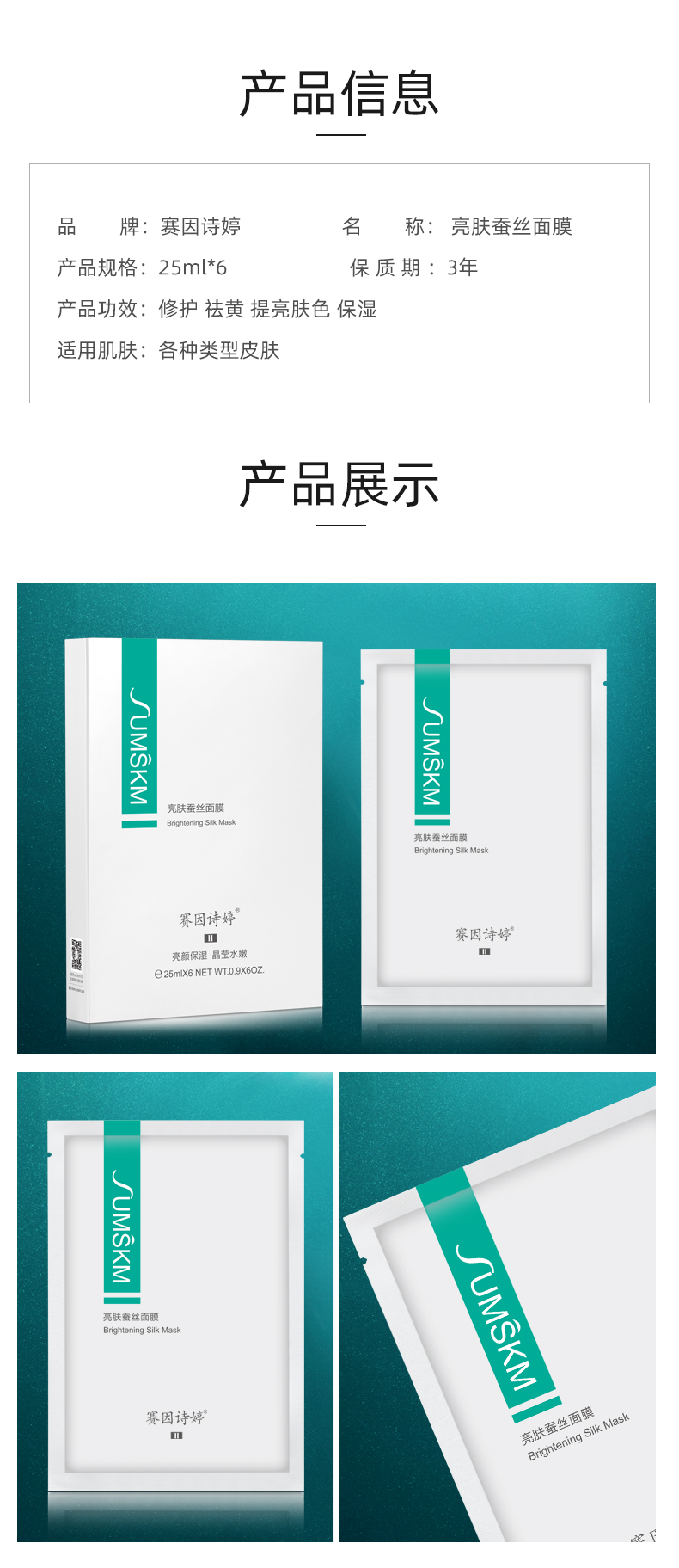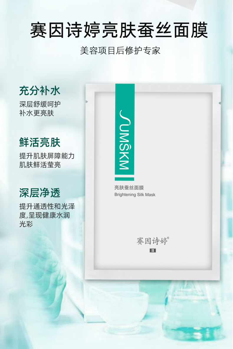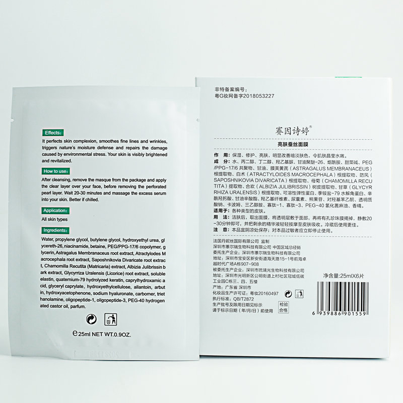 • 商品名称:赛因诗婷 亮肤蚕丝面膜25ml*6片 改善暗黄、保湿修护、晶莹水嫩、适用于激光术后提亮肤色