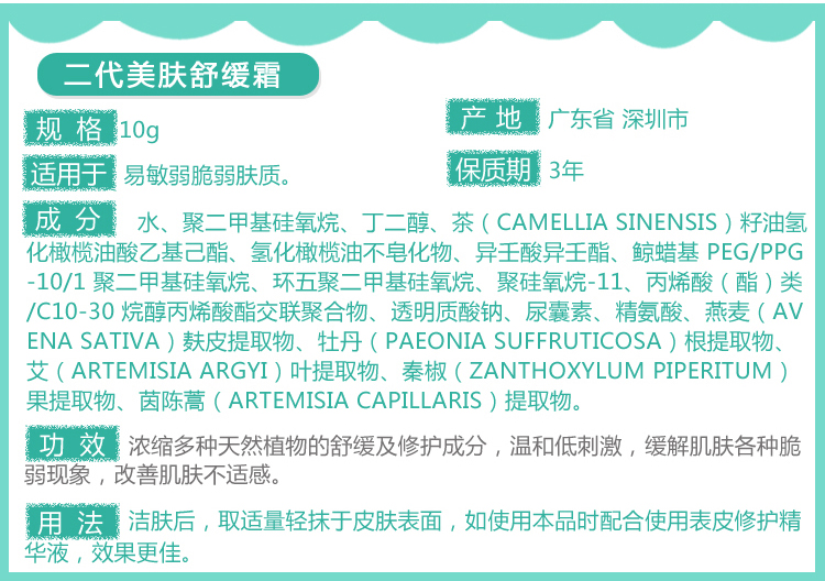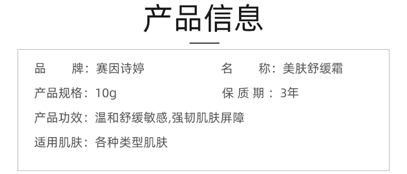 • 商品名称:赛因诗婷 美肤舒缓霜10g 急救敏肌、即刻舒缓、淡褪泛红、强韧屏障、改善敏弱肤质