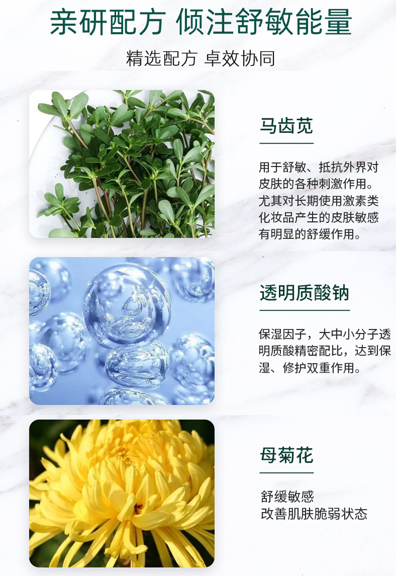 浓缩多种天然植物的舒缓及修护成分,温和无刺激,缓解肌肤各种红敏脆弱现象,改善肌肤不适感