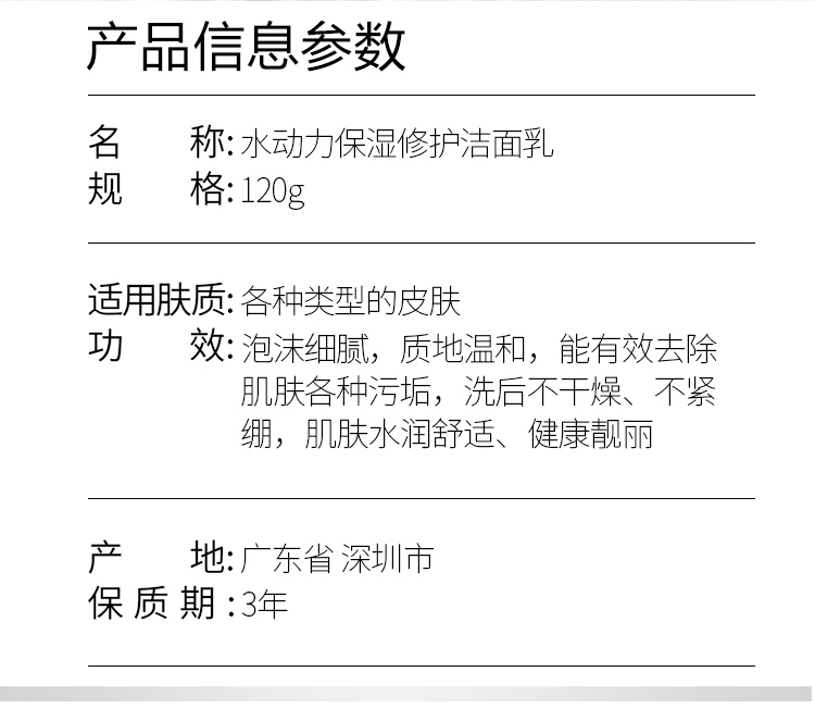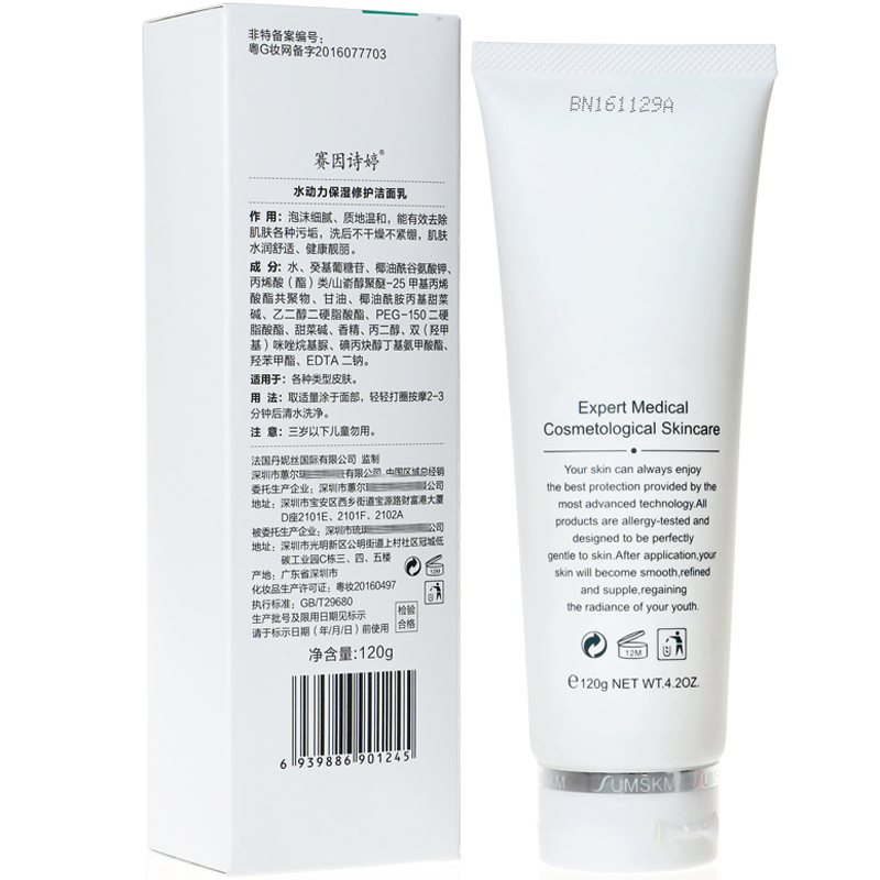 • 商品名称:赛因诗婷 水动力保湿修护洁面乳120g 质地温和、泡沫细腻、去除各种污垢、敏肌可用