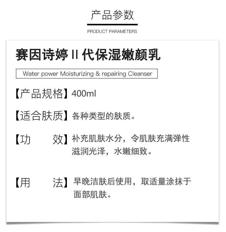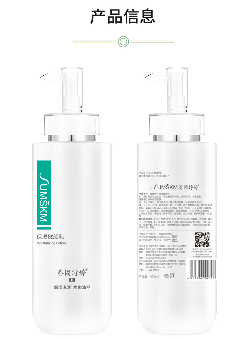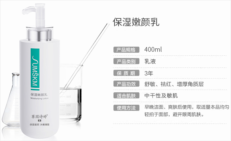 • 商品名称:赛因诗婷 保湿嫩颜乳400ml 滋润保湿、水嫩细致、弹性光泽、舒缓修护、改善红敏