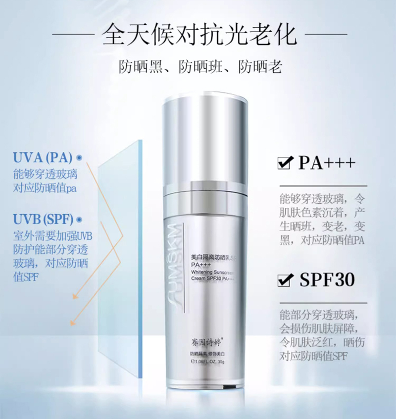 ① 防晒隔离:它的防晒系数为SPF30+/PA+++,可以有阻隔UVA、UVB及环境中之各种有害光线和粉尘,让肌肤不会晒伤晒黑,让肌肤一整天不受侵害。