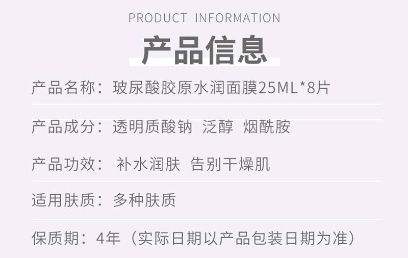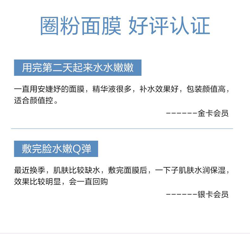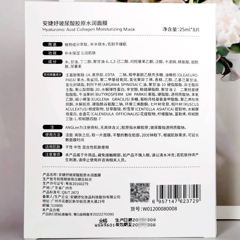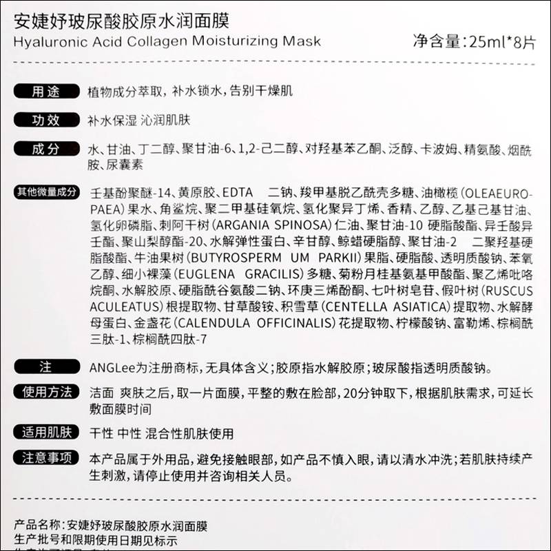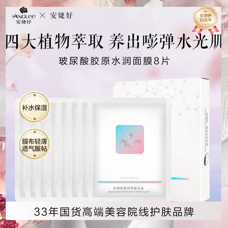 • 商品名称:安婕妤 玻尿酸胶原水润面膜25ml*8片 膜布轻薄透气服帖、水嫩弹滑、循环补水、润泽保湿、净透光亮