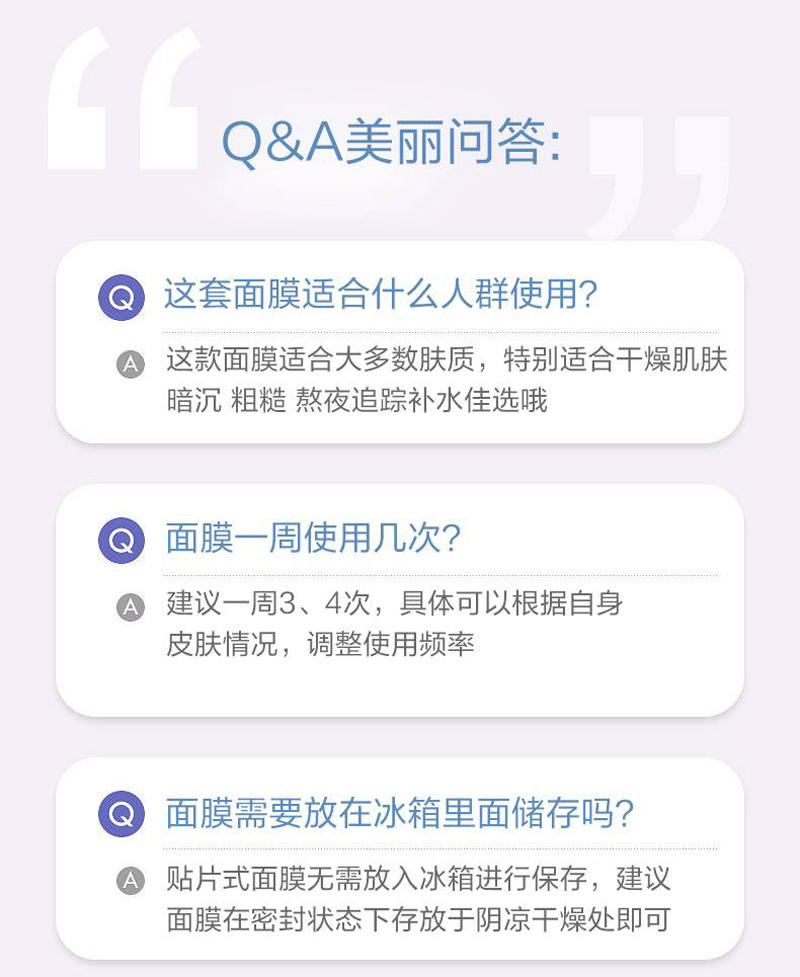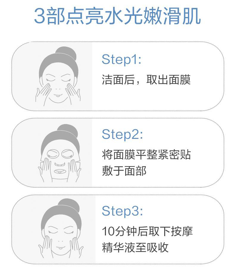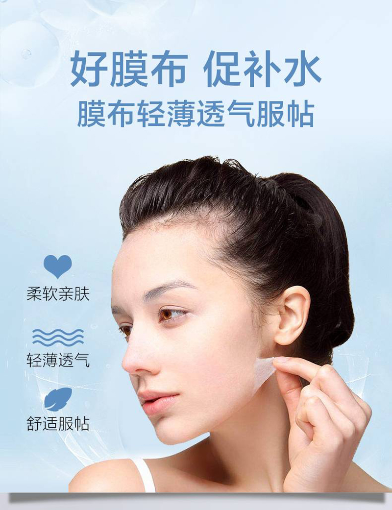 植物成分萃取,补水锁水,告别干燥肌 ,补水保湿,沁润肌肤。洁面爽肤之后,取一片面膜,平整的敷在脸部,20分钟取下,根据肌肤需求,可延长敷面膜时间