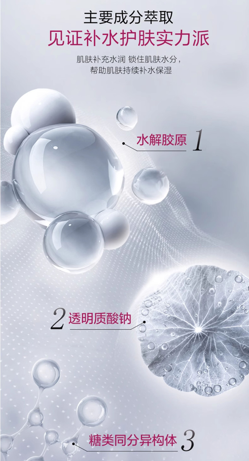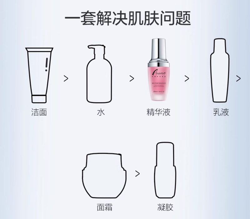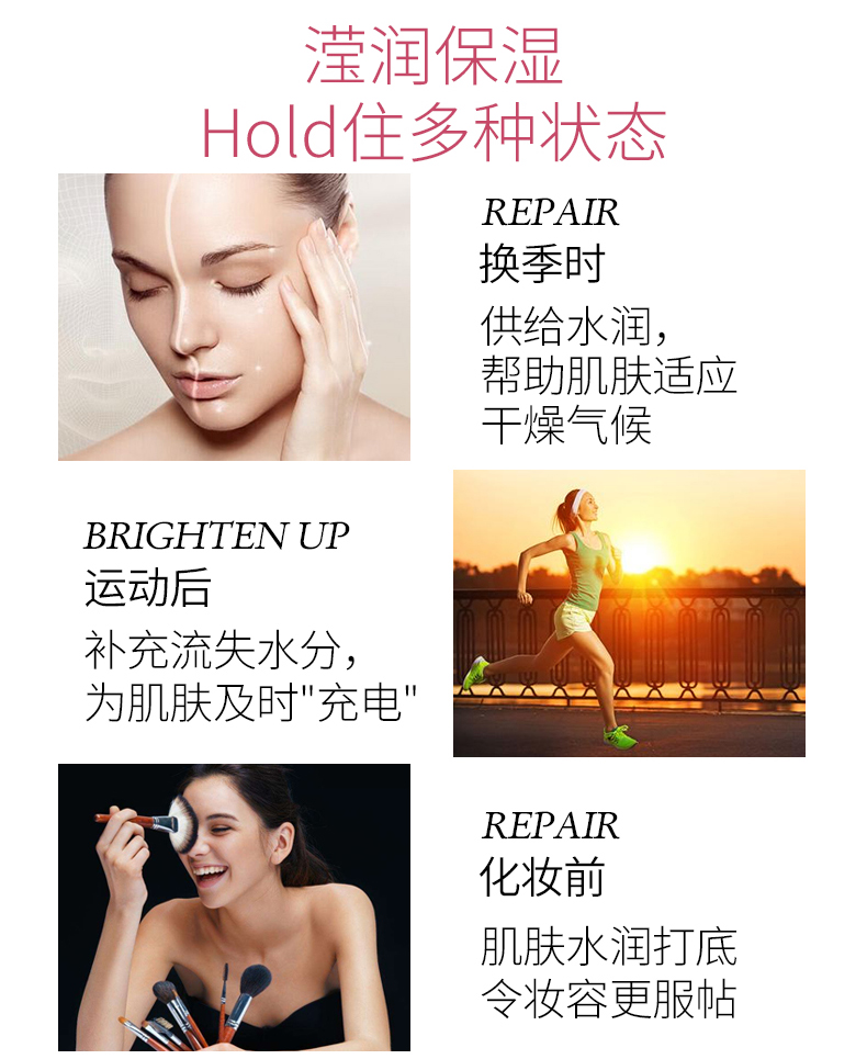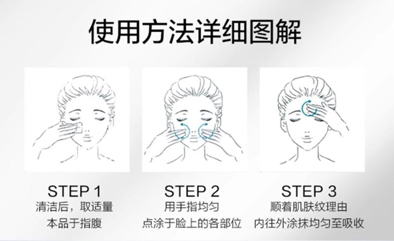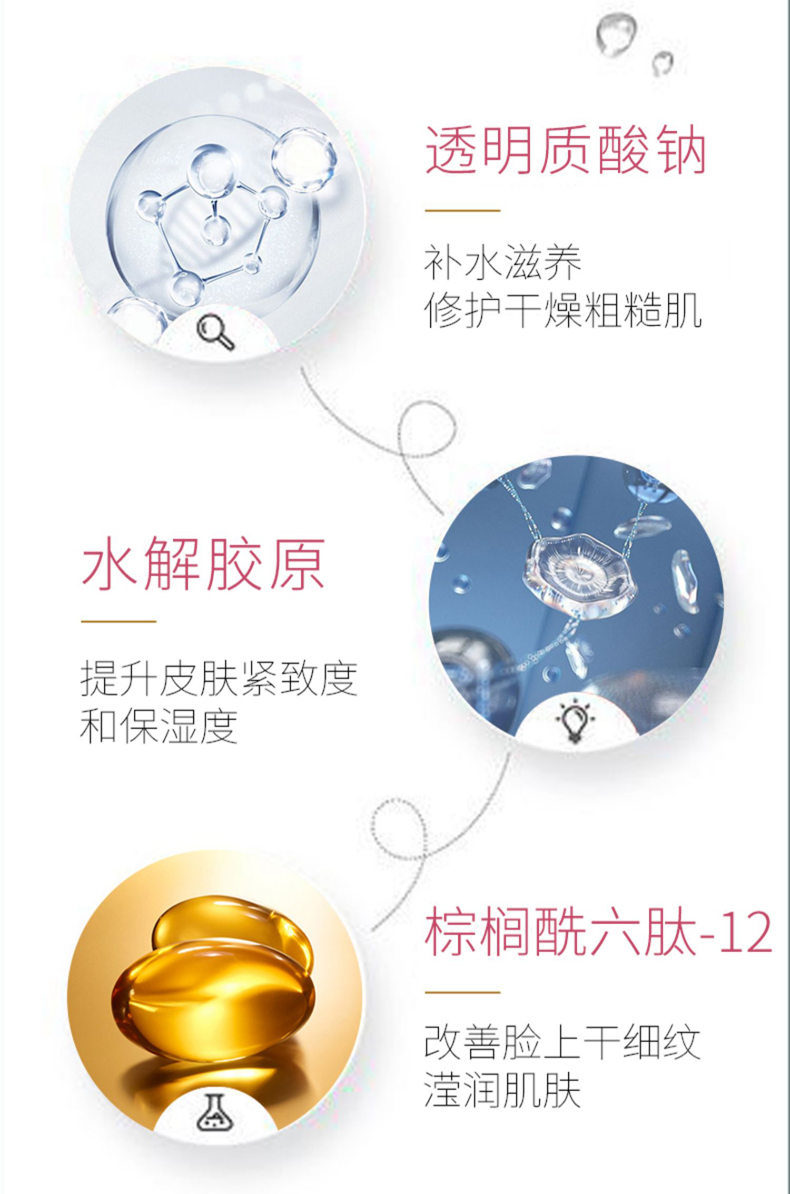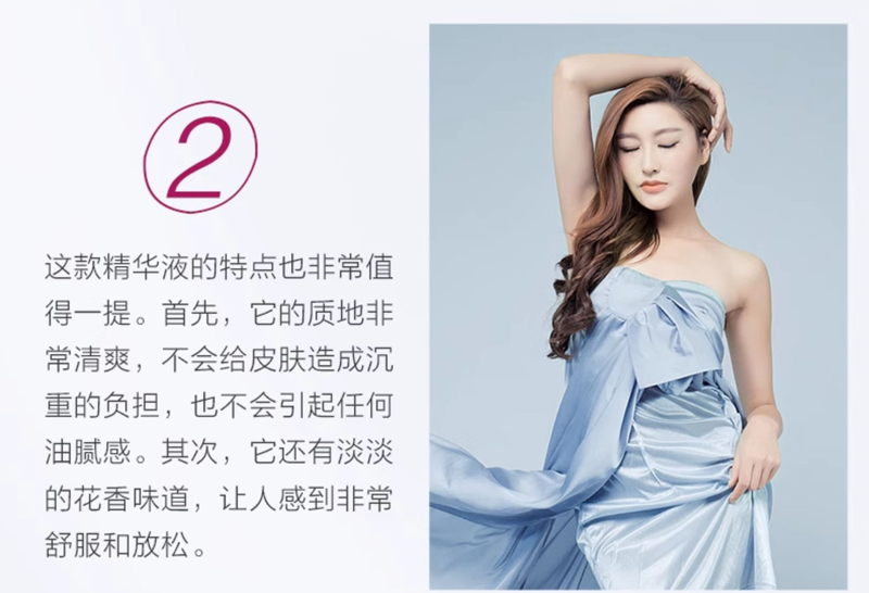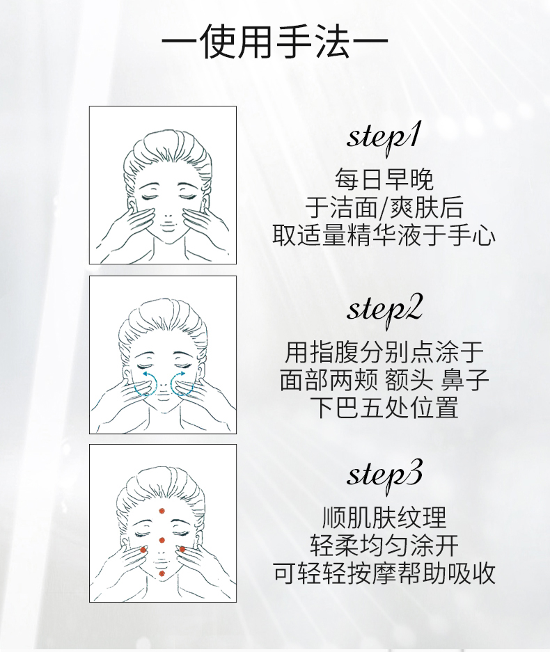 含浓缩精华能让增殖在生,同时滋润保湿。赋活组织,使肌肤紧实有弹性,进而减少细纹,重现润泽的健康光采