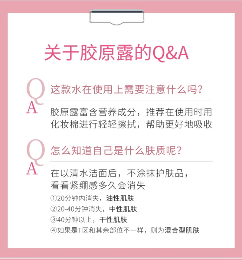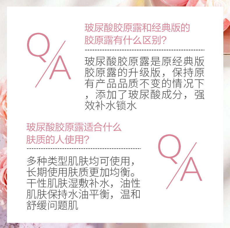 一款兼具保湿、滋养的精华水。其蕴含的透明质酸钠及双重胶原成分补充肌肤所需水分及养分,赋予肌肤水润感与弹性。经常使用,肌肤逐步绽放青春光彩,紧实、柔嫩、平滑。