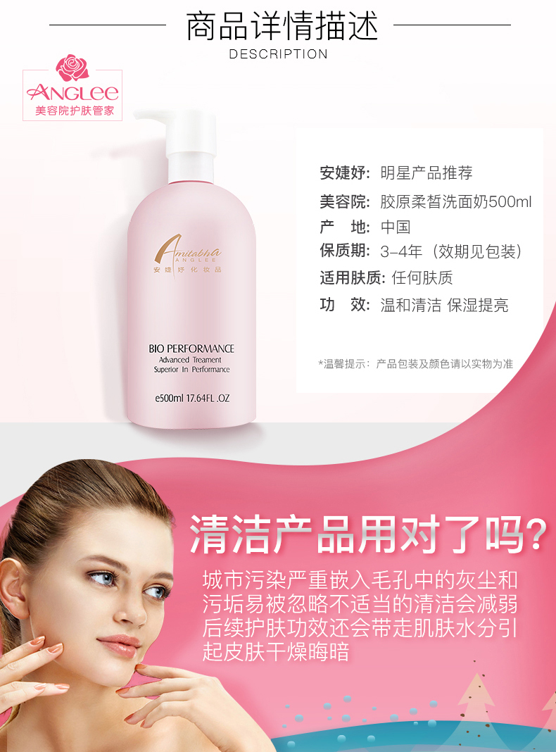 • 商品名称:安婕妤 胶原保湿柔皙洗面乳500ml 泡沫丰富、清洁毛孔/污垢/油脂、改善暗黄肌、清透光滑、洗后不紧绷