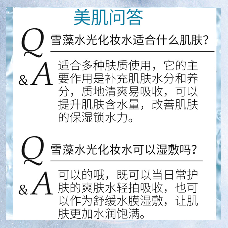 产品功:添加肌肤净化能量雪藻精华,为肌肤提供能量,保湿因子复合精华,层层渗透,改善肌肤粗糙,让肌肤水嫩、平滑、净透、匀净,呈现水光质感。 温和,源源不断地给肌肤注入水分,轻松解决肌肤粗糙与干燥现象,全然不同的愉悦亲水特质,令肌肤水嫩清爽,并舒缓紧张、疲倦之肌肤,同时为肌肤注入活力,开启健康水润肌肤的活力源泉,焕发清新亮泽。