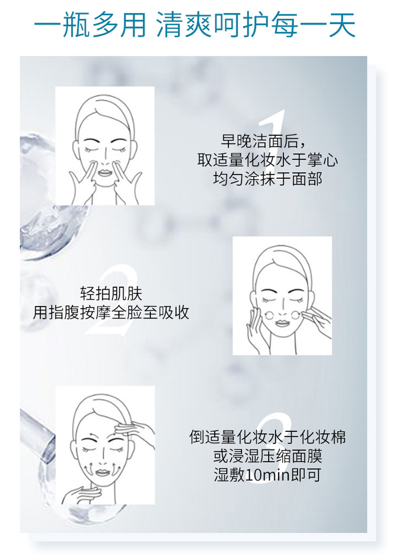 使用方法:早晚洁肤后,轻拍于整个脸部至吸收。