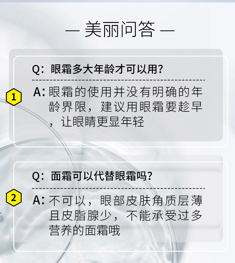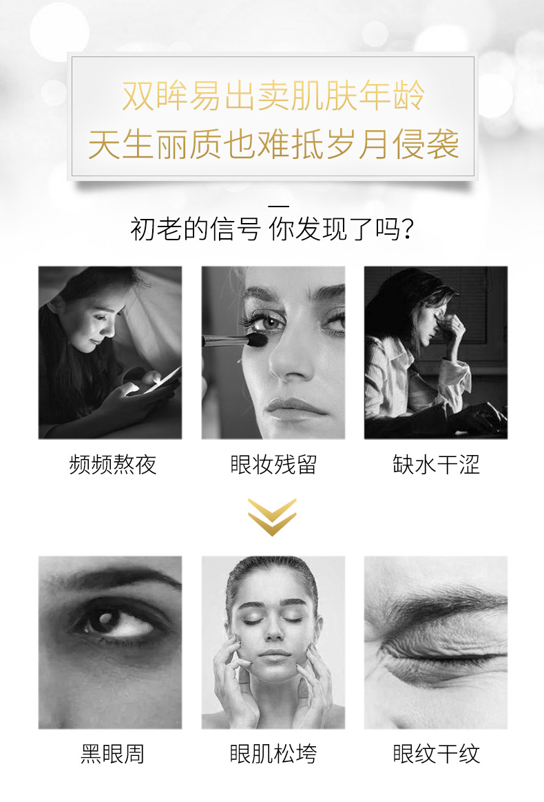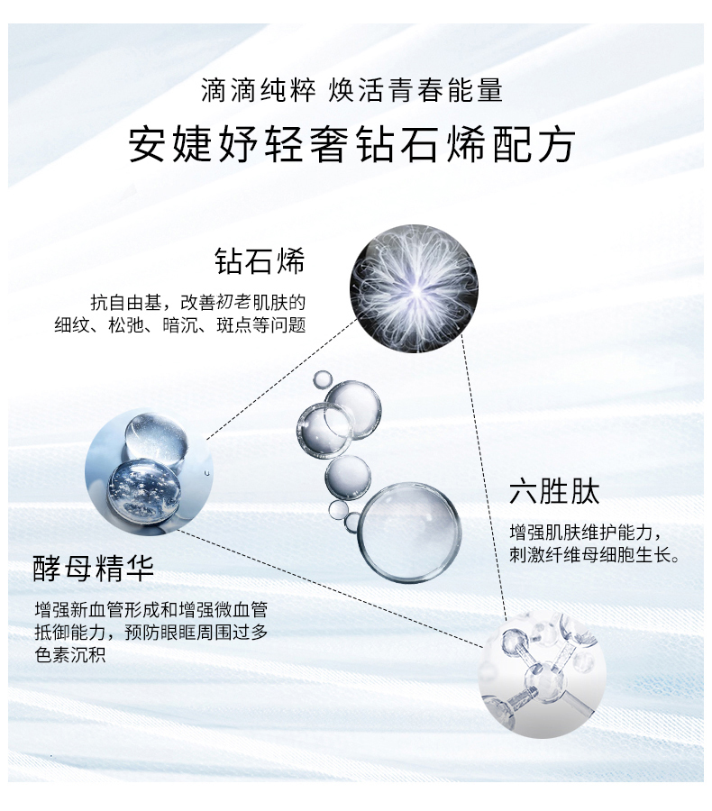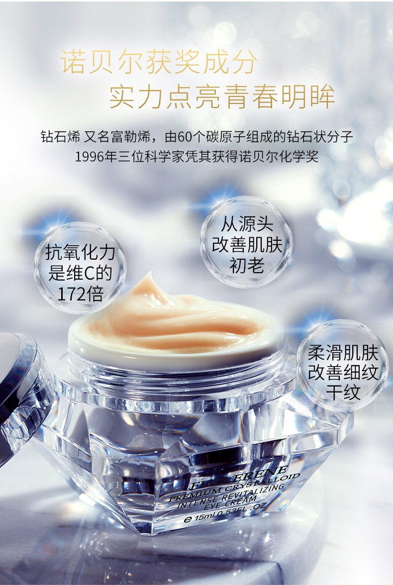 钻石烯复配酵母精华、辅酶Q10,可焕亮眼周、改善眼周皱纹,让眼周肌肤感受丰润滋养,尽显柔滑紧密,双眸焕发年轻(尤其适合松弛,无弹性,有细纹的肌肤)