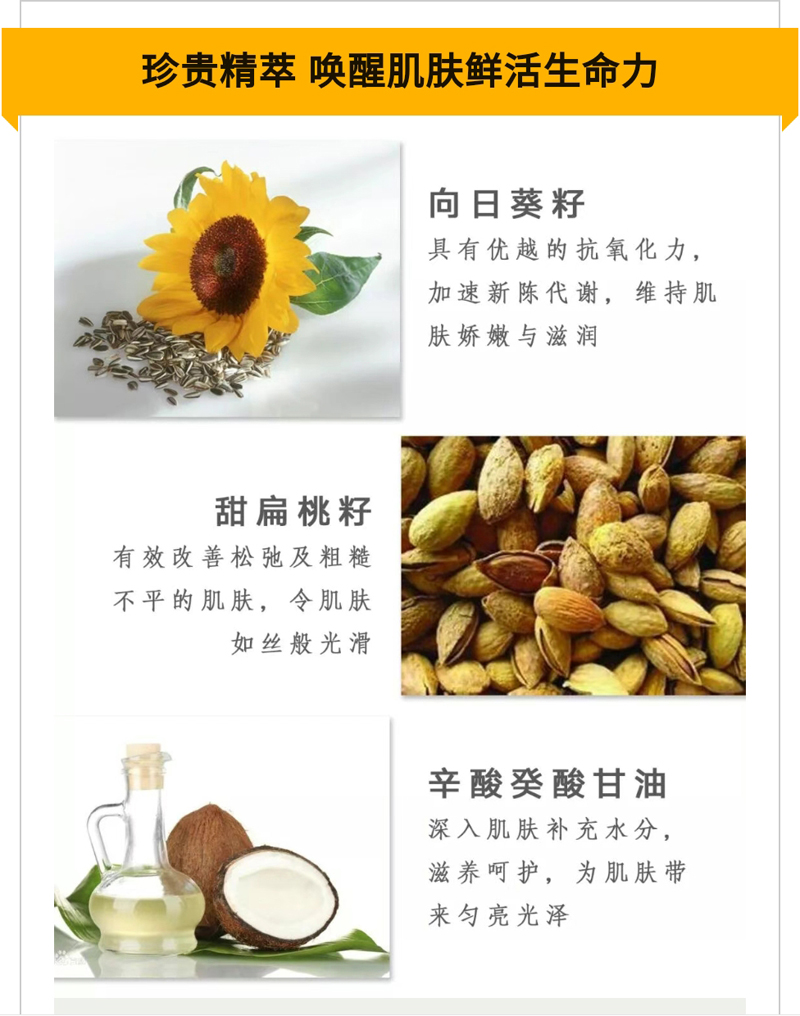 植物萃取精华成分,深入滋养肌肤,巩固肌肤弹性与柔软性,时刻呈现水嫩光滑的肌肤,保护天然皮脂膜,回复年轻状态