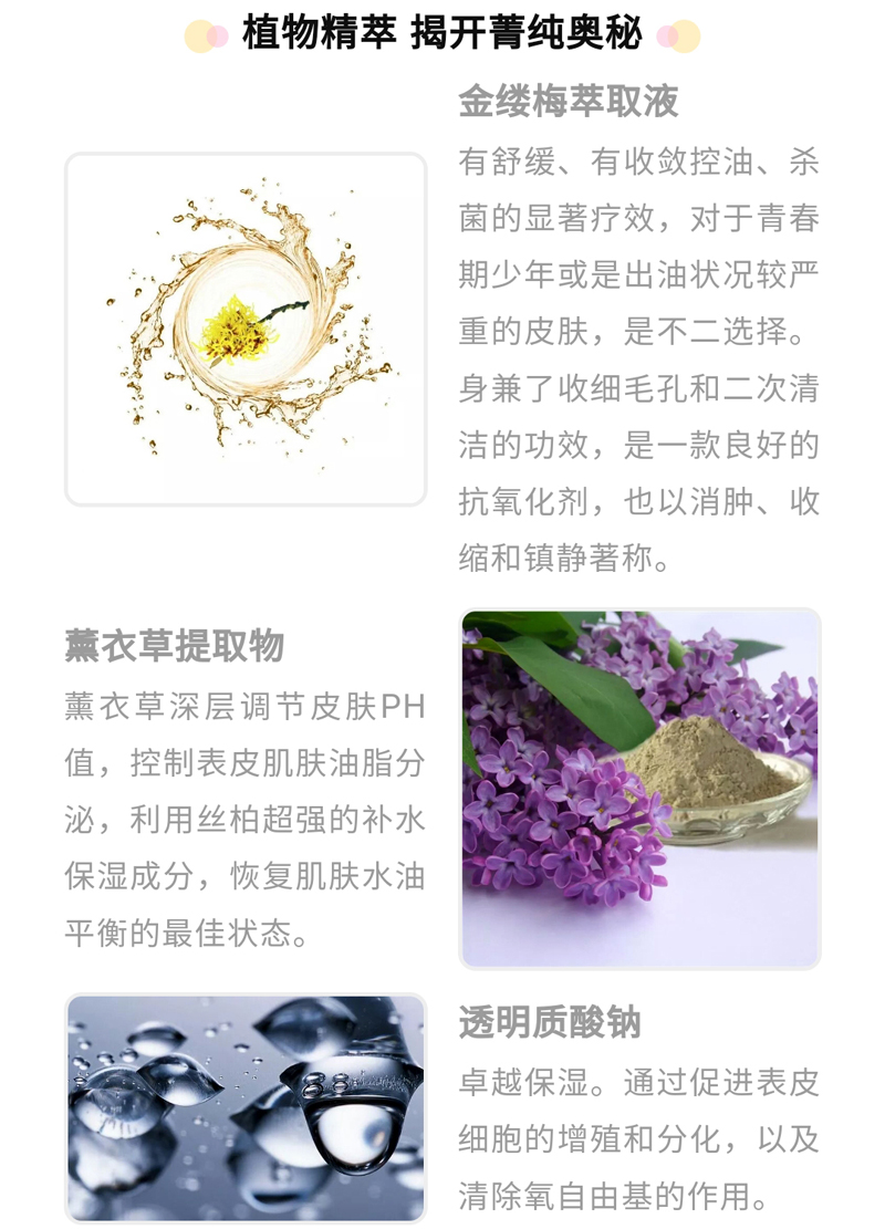 产品功效:蕴含丰富薰衣草、金缕梅、秦椒果等多种天然有机植物提取成分,补充肌肤所需水分及养分,保持肌肤清洁舒畅,长时间清爽不油腻。平衡油脂分泌,收缩毛孔,软化角质,帮助后续护肤品更好吸收,起到再次清洁的作用,重整肌肤弹性,深层滋养,使肌肤紧致、细腻、柔滑。