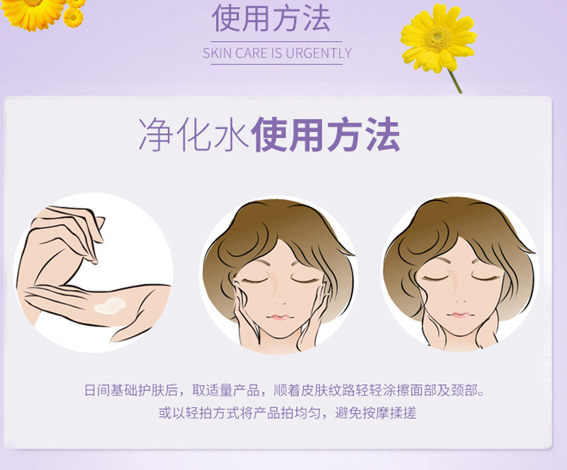 使用方法:洁肤后取适量本品均匀用于面部和颈部并轻拍至吸收,也可根据需要随时使用或搭配相应的安瓶和面霜使用,效果更佳。