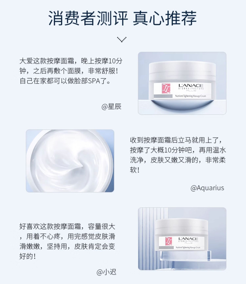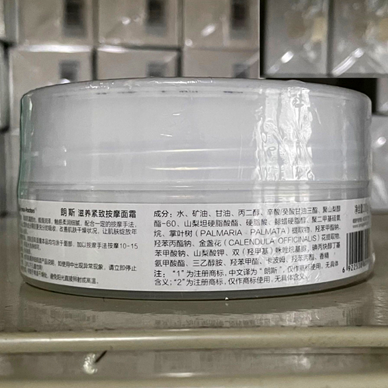 • 商品名称:朗斯 润养紧致按摩面霜200g 紧致抗皱、盈润保湿、洁净舒爽、软化角质、帮助吸收