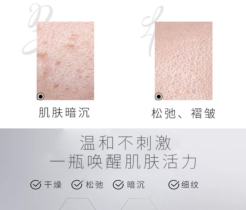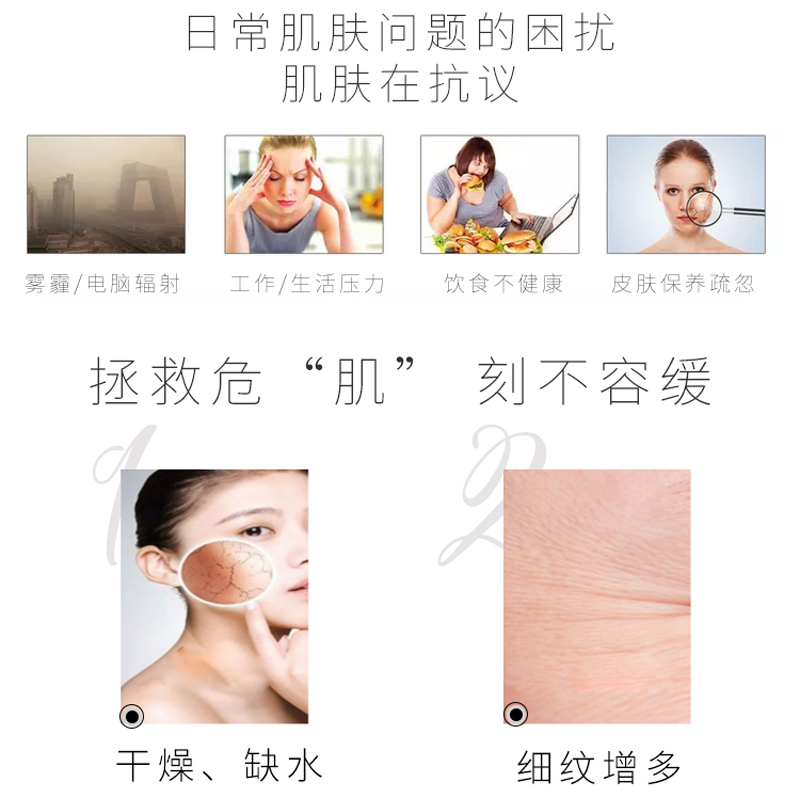 产品说明:增加皮肤弹性,改善皱纹,改善黯黄,收缩毛孔,提拉紧致,补水保湿