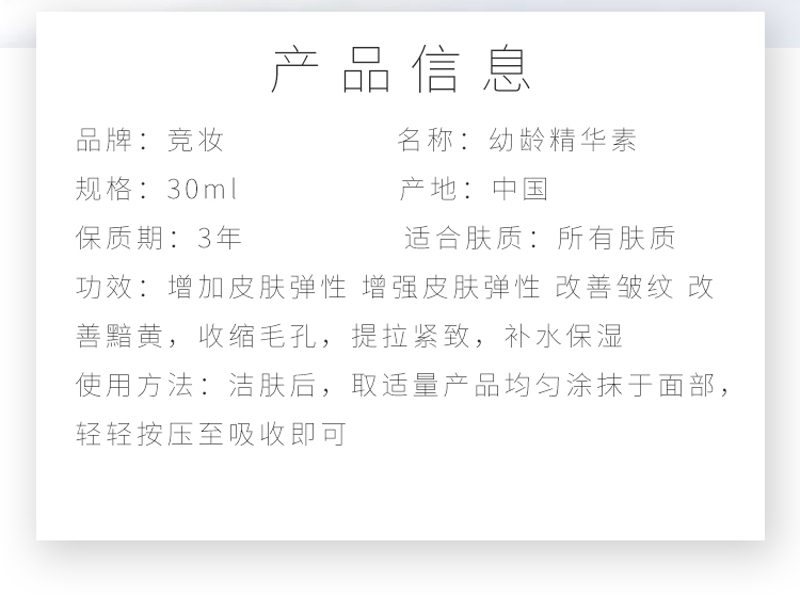 • 商品名称:竞妆 竞妍精华油30ml(幼龄精华素)以油养油、修护屏障、幼嫩美肌、改善暗黄、紧致弹性、减淡皱纹、补水保湿