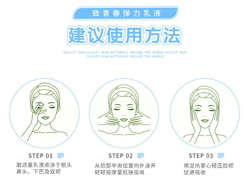 亲肤易吸收,滋润并促进肌肤胶原蛋白的合成,紧致提升面部轮廓,肌肤平滑幼嫩,青春Q弹