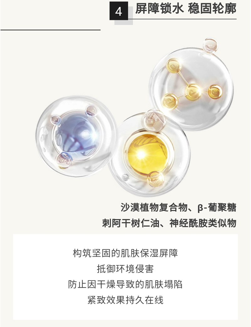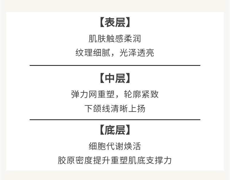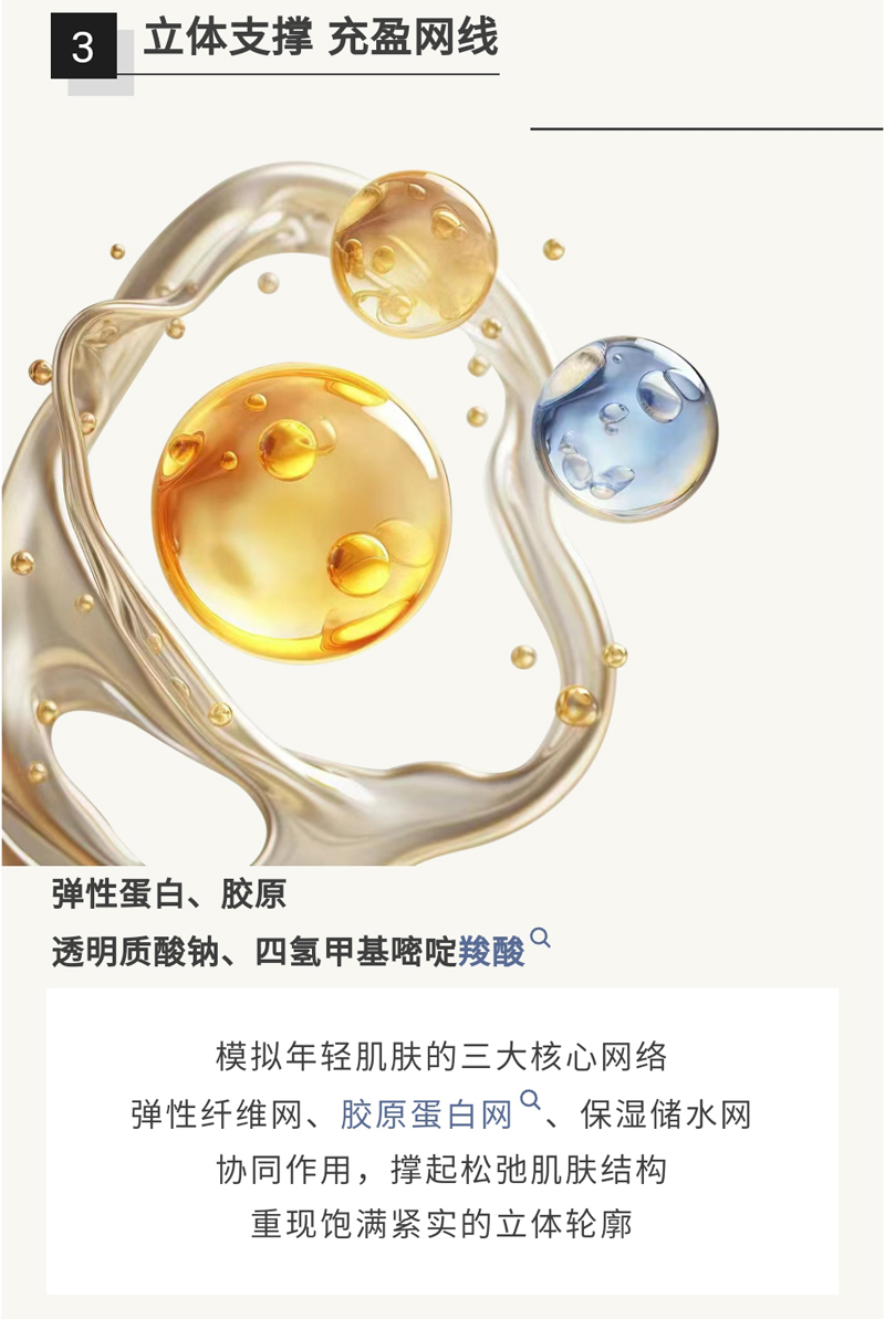 轻薄质地,易吸收,蕴含多种护肤成分,提升肌肤紧致度,令肌肤弹嫩细致、饱满而富有弹性。富含多重植萃营养,抗皱、紧致、保湿三步抓,改善肌肤干纹、细纹,令肌肤更显紧致嘭弹