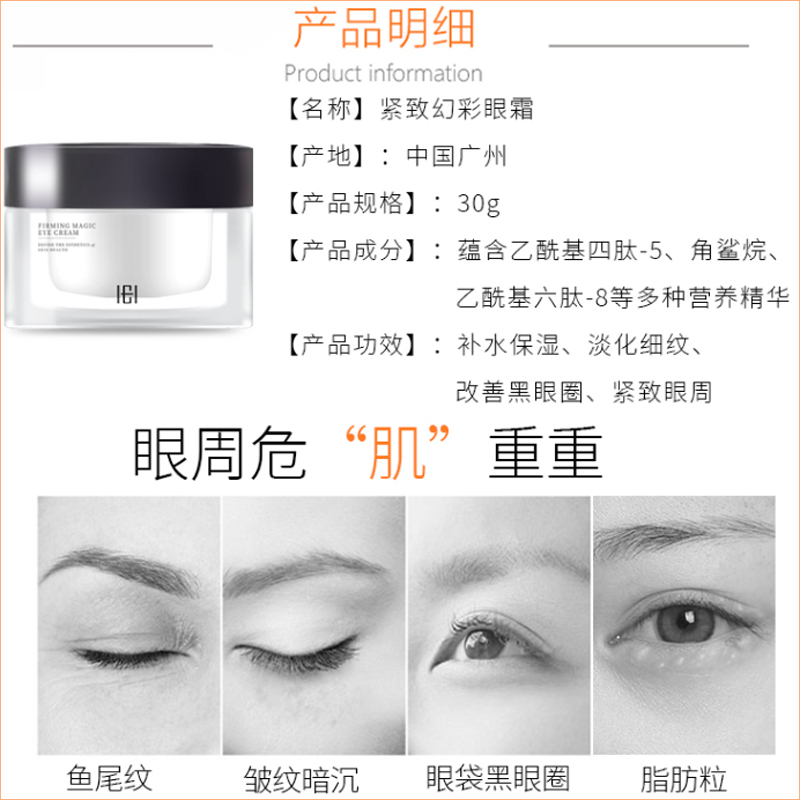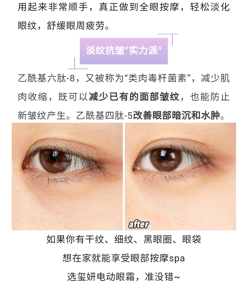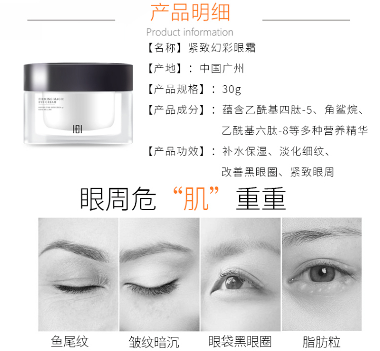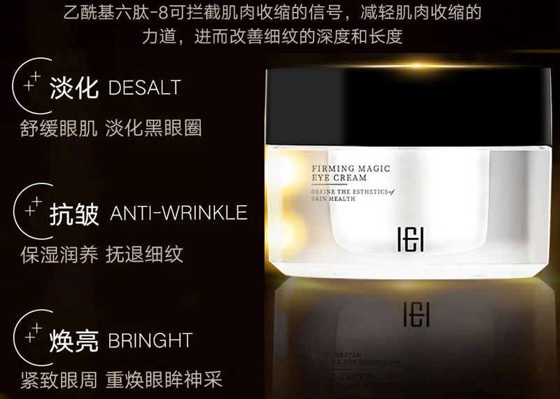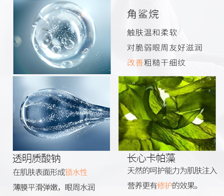 细腻的霜体质感,舒润柔滑,淡化细纹皱纹,去除黑眼圈,眼部赋活焕新,绽现年轻光采(定向抚纹,逆龄新生,深层补水-滋养眼周肌肤。击褪暗沉-告别眼圈眼袋。水嫩双眸-保持年轻状态)