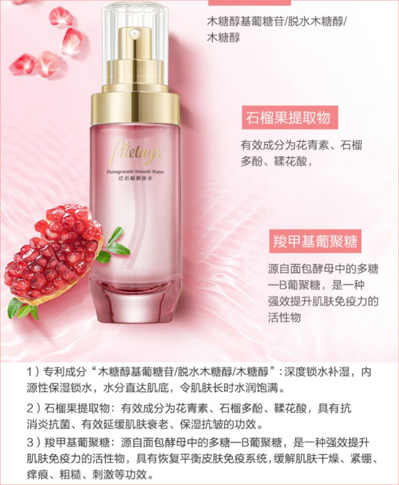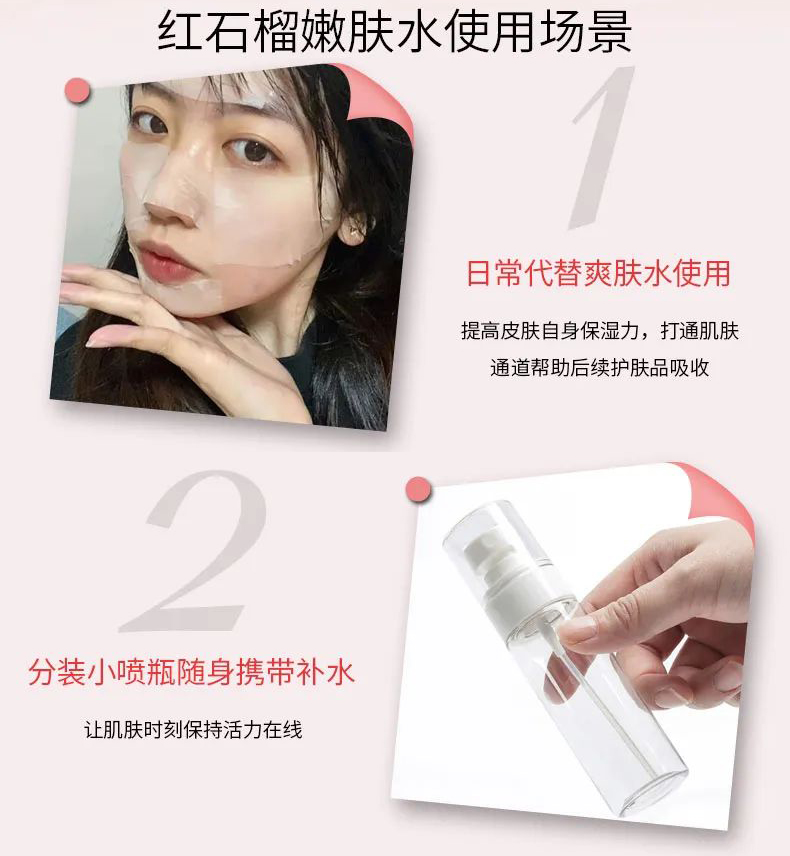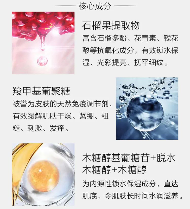 产品功效:蕴含石榴果提取物,给予肌肤清新、水嫩肤感。