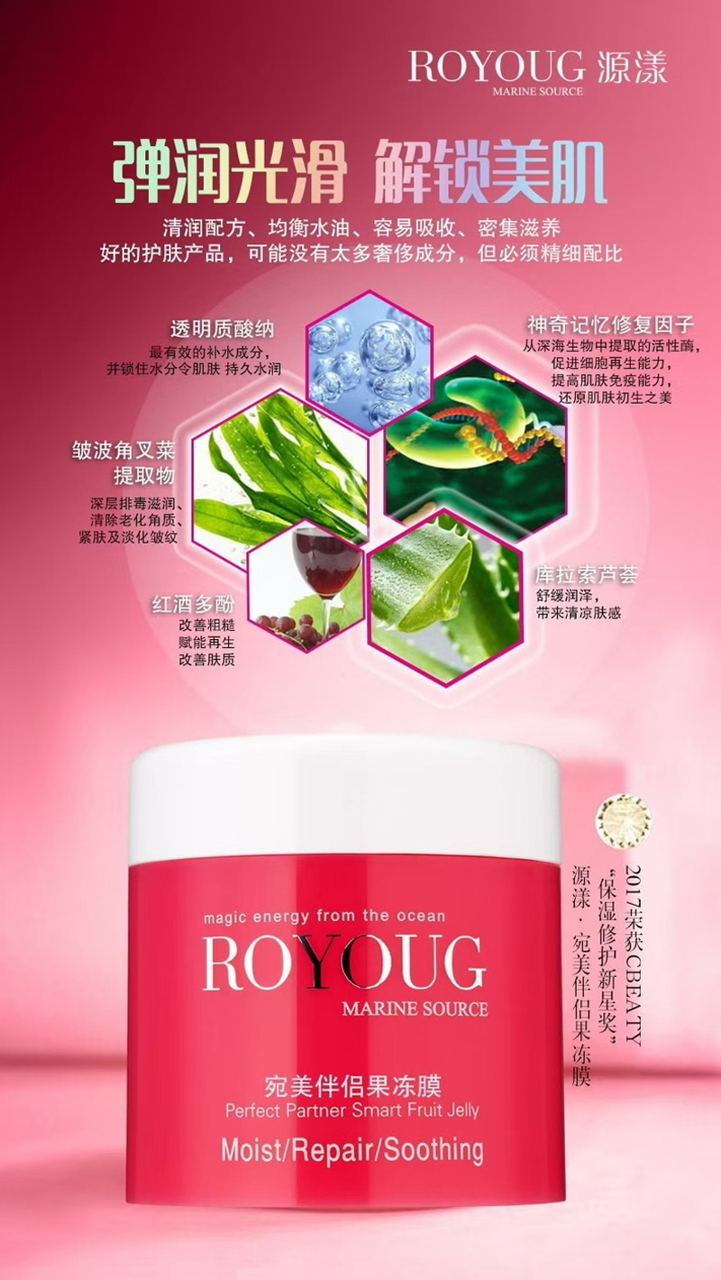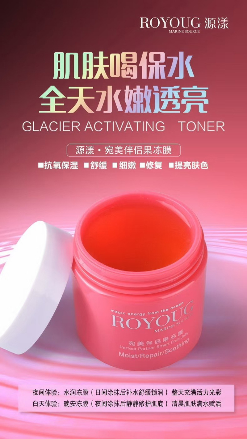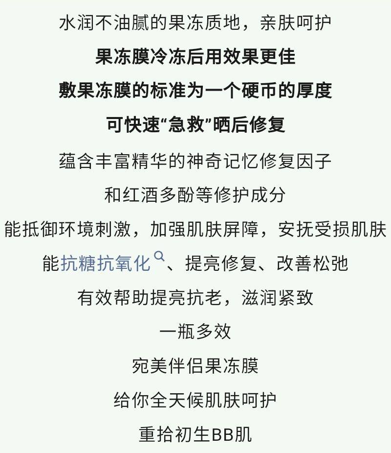 一款可以天天用使用的保湿果冻膜,拥有[多重加湿补水配方],修复受损肌底,还原初生之美